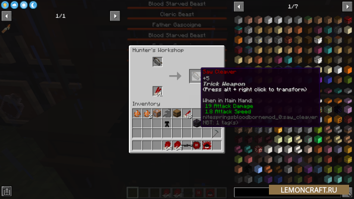 Мод на кровь и безумие Blood And Madness посвящен всем тем, кто любит охотиться на кровожадных и уродливых монстров. Мод добавляет в игру различную экипировку из игры Bloodborne, а так же новых мобов. Вы сможете улучшать свое снаряжение, убивая монстров и получая с них нужные компоненты. Вперед к новым сражениям!!!